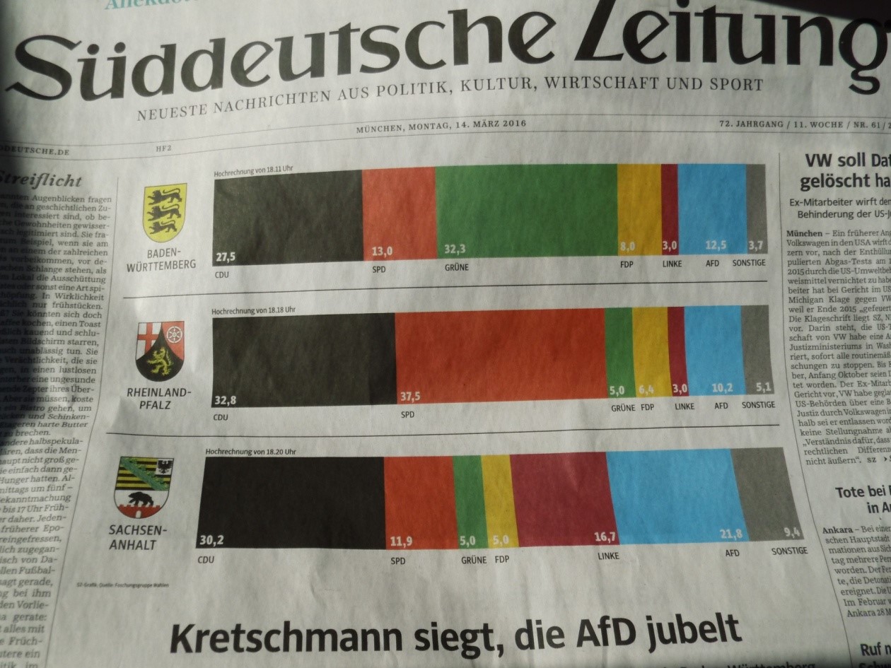2016年3月の第2日曜日に連邦の三州( Bundesland )で州議会選挙が行なわれました。メディアでは先ほどあったアメリカのスーパー・テューズデーに習ってスーパー・サンデーと銘打ち、実質的にはメルケル連邦首相の難民受入政策の是非を問う形となり、その趨勢に大きな関心が集まりました。