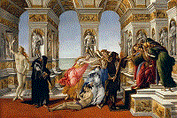 今までに見たボッティチェッリの絵は一種のナラティブで寓喩となっていますが、これを極端に推し進めたのが『アペレスの誹謗』です。アペレスはアレクサンダー大王の時代の有名な画家で、現存している作品は皆無ですが、中でもローマに持ち出された『海から上がるヴィーナス(アフロディテ)』が有名で、ボッティチェッリの『ヴィーナスの誕生』にインスピレーションを与えたことでしょう。アペレスは、ギリシアの作家ルキアノスによると、他の画家に誣告され、後に無実が証明された後、その顛末を一枚の絵にしたと言われています。この失われた絵をボッティチェッリが再現したのが『アペレスの誹謗』です。
