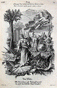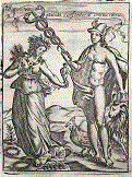 中世まではキリスト教が思想的にも支配的だったため、万物が神の創造であることを背景とすると、被造物がどのようにして神を指示しているかと言うことを探る Allegorese (寓喩解釈)が盛んとなりました。そこでは上記よりも簡単な、先に見た死神やユースティティア(ディケー)のような寓喩も数多くあります。例えば、平和を擬人化したユースティティアの姉妹の平和の女神(Pax, Eirene)が、次のような様々な平和の象徴と共に描かれたりしています。最初の図では、二匹の蛇が巻き付いた平和の象徴カドゥケウスの杖*6を持つヘルメス(マーキュリー)と共に月桂冠を被り、手には富の象徴プルトンと豊穣の象徴の穂束を持ち、次の図では、槍や盾を焼こうとしているパクス(エイレーネ)と後方に休んでいる軍神マルスが見られます。